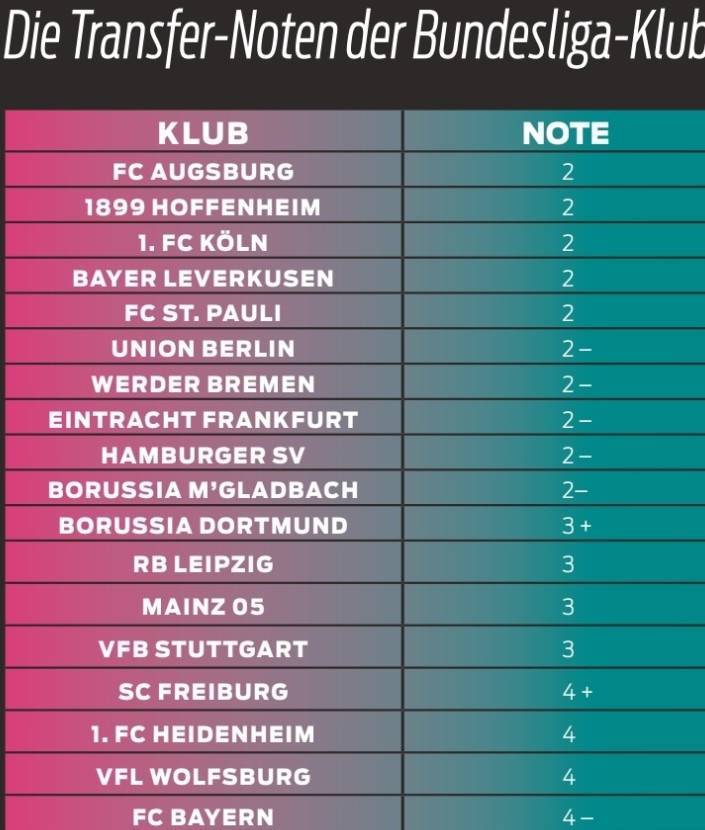 直播吧9月3日讯 欧洲五大联赛转会窗已经关闭,《图片报》对德甲18队今夏转会运作情况进行了打分,其中拜仁4-最低。